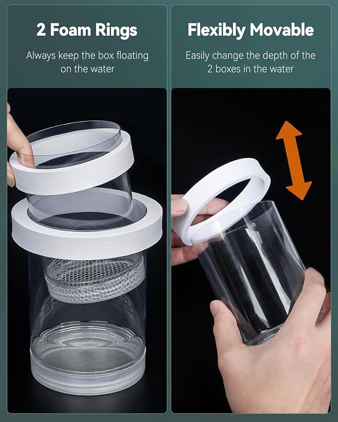 - Floating Design: No suction cups required! 2 foam rings with negligible weight easily keep the plastic isolation box floating on the water at all times. And the depth of the 2 boxes in the water can be changed at will by moving the foam rings up and down