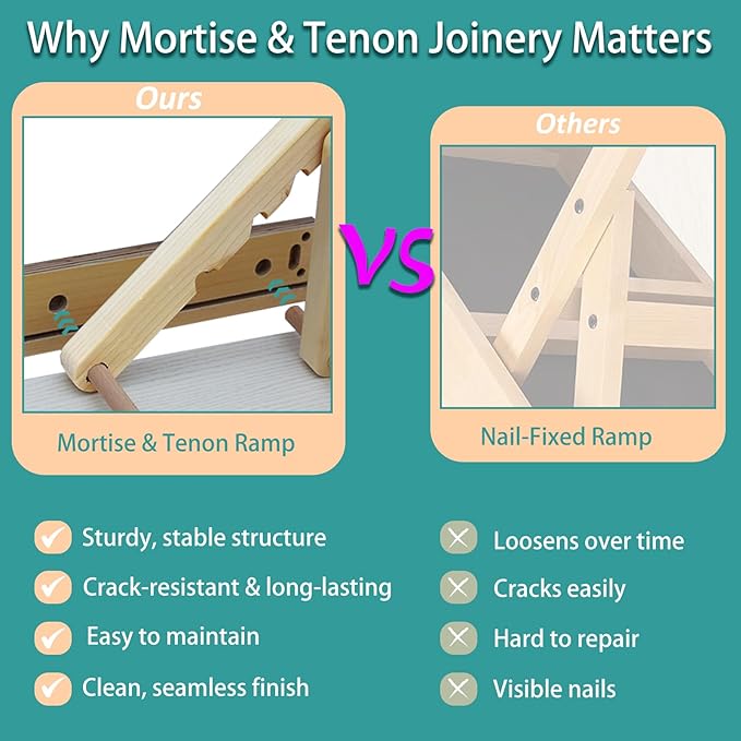 - 【Superior Grip & Anti-Slip Features】With a high-traction carpet and a rubberized surface, the wooden ramps ensures your pet won’t slip while climbing. The anti-slip rubber feet prevent sliding, making it safe for use on hardwood floors and carpets without causing damage.