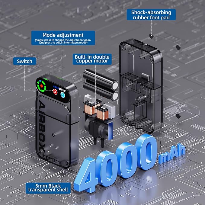 - 【Adjustable/Dual Modes】Features 4-speed airflow adjustment with smart dual-mode switching. This bait pump is equipped with a circular indicator light precisely show operation status, battery level, and airflow settings. intermittent mode reduces consumption, ideal for aquarium maintenance, portable bait containers, and long-haul transportation