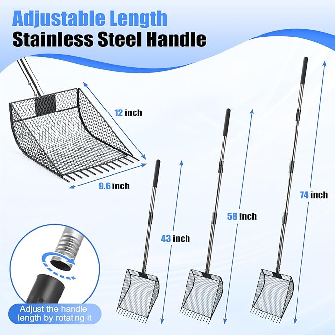 - Large Capacity Curved Metal Litter Scoop - Made of heavy duty metal head shovel & rake and stainless steel handle with soft rubber grip for long-term use.The chicken poop rake for sand head is 9.6" wide, the curved depression greatly increases the capacity of the chicken coop shovel, which can clean a large area at a time, saving time and increasing efficiency