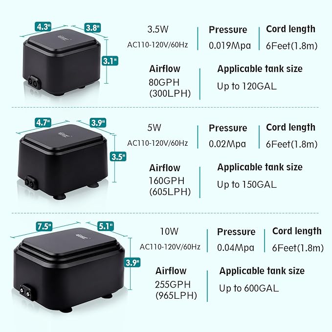 - Double Air Outlet Pump: The bubbles are even,natural and stable. Can be connected to nano air stone, biochemical sponge filter, landscaping windmill rockery, aquarium air shell and other aerobic landscaping equipment. Suitable up to 120gallon fish tanks (cannot exceed 3.9 feet water depth)