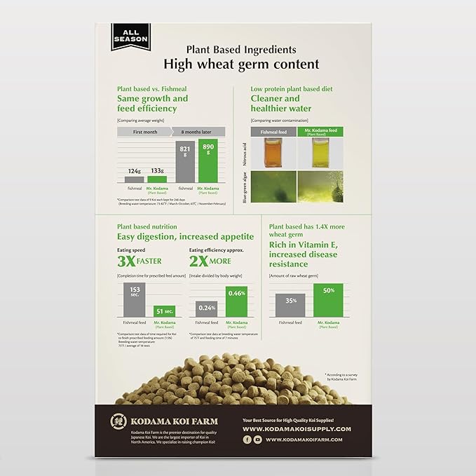 - INCREASED DISEASE RESISTANCE: Made with highly nutritional wheat germ rich in Vitamin E, Mr. Kodama Plat Based Koi Food helps koi mount a stronger immune response against various pathogens, including bacteria, viruses, and parasites.