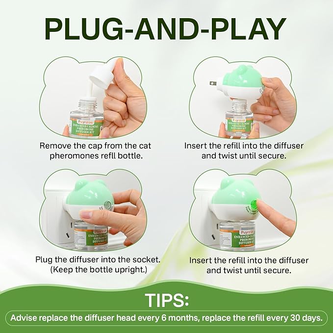 - SAFE FOR CATS AND FAMILY: The Puyrzoe cat calming diffuser features an odorless, non-toxic formula made without artificial fragrancesโperfect for households with pets and kids. Inspired by natural feline appeasing pheromones, it gently signals comfort and security to your cat, making it a great choice for cats of all ages.