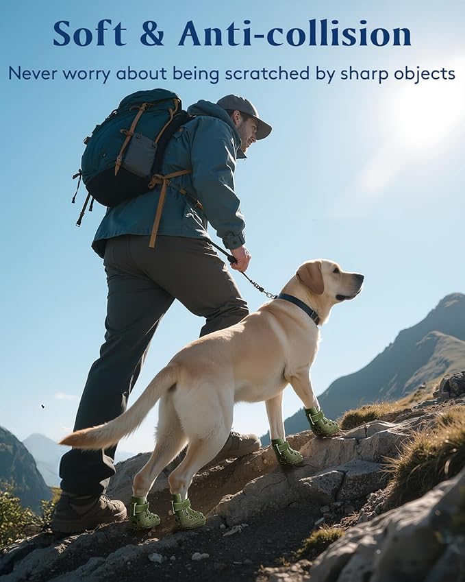 - ANTI-SLIPοΌThe silicone material make the dog booties for hot pavement are soft, light, comfortable and anti-slip. The sole is designed with reference to human football sole particles, so the dog booties can provide stability and grip, help dogs stand firmly and walk freely on slippery/wet surfaces, they can be used as dog snow boots, dog rain boots, dog recovery boots.