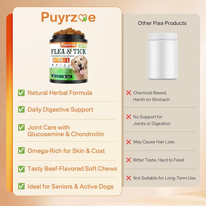 - Natural 5-in-1 Flea & Tick Defense: Puyrzoe Natural 5-in-1 Dog Flea and Tick Treatment Chewables feature unique and natural ingredients, including Neem, Brewer's Yeast, Glucosamine, Chondroitin, and Vitamin B. This daily supplement not only helps support a natural balance approach to flea and tick care, but also supports immune health and joint health. Especially suitable for active outdoor dogs and seniors, helping them soothe itching and enjoy natural protection.