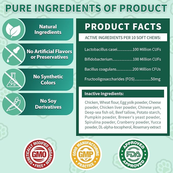 - Clean & Safe Ingredients You Can Trust -Made with premium chicken, pumpkin, spirulina, natural oils and brewerโs yeast, this cat probiotic supplement contains no soy, wheat, or artificial additives. Tasty and effective support for digestion, skin, and coat healthโsuitable for cats of all breeds and ages.