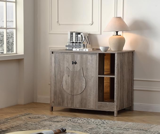 Cat-Faced Doors Cat Litter Robot Enclosure,Automatic Litter Box Enclosure for Litter Robot 3/4,Power Outlet for Litter Robot Cabinet,Litter Collector,Dog-Proof Adjustable Shelf,Grey