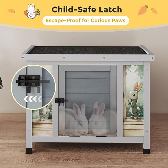 COZIWOW 24in Wooden Cat House Outdoor & Indoor Pet Shelter with Foldable Ramp - Weatherproof Rabbit Hutch with Unique Machine-Printed Art Designs for Cat, Rabbit, Guinea Pig (Grey)