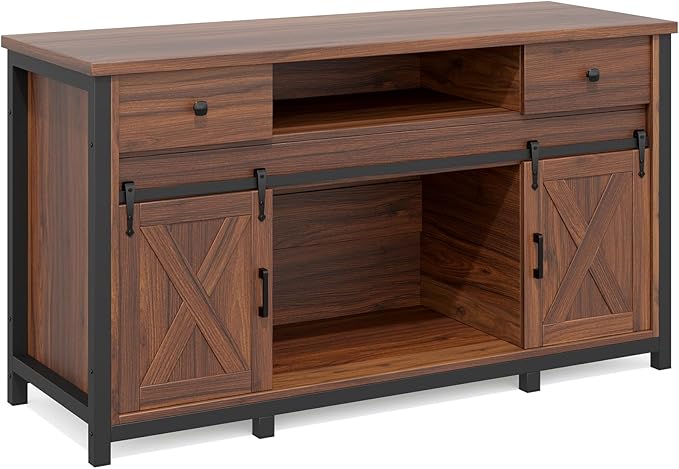 Miereirl 75-120 Gallon Fish Tank Stand with Power Outlet – Heavy Duty Aquarium Stand, Rustic Farmhouse Style, 1000 lb Capacity, Adjustable Storage & Sliding Barn Doors, Light Brown