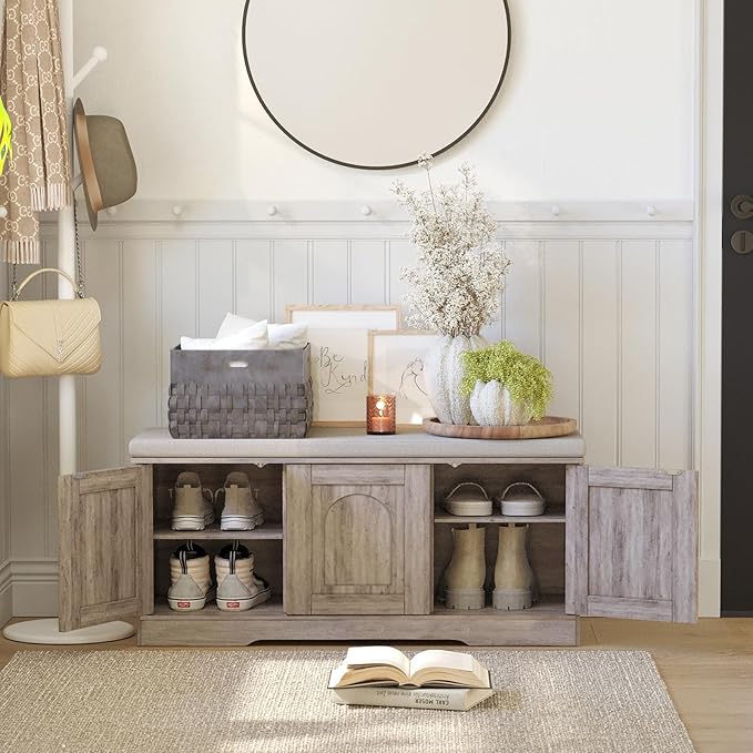 - 【Effortless Push-to-open Door】Feature a fully enclosed design with a press-to-open mechanism, keeping shoes clean and tidy while avoiding accidental bumps against door handles during use. Reasonable height and soft cushion let you change shoes by sitting on the bench more comfortable without bending down or squatting