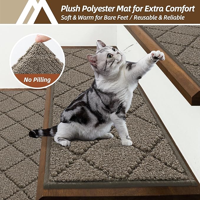 COSY HOMEER Stair Treads for Wooden Steps 9"x28" Washable Indoor Carpet Stair Treads Non Slip Soft Polyester Stair Carpet Tread Reusable Stair Runner Rugs for Kids, Elders,Pets,Light Brown,7pcs