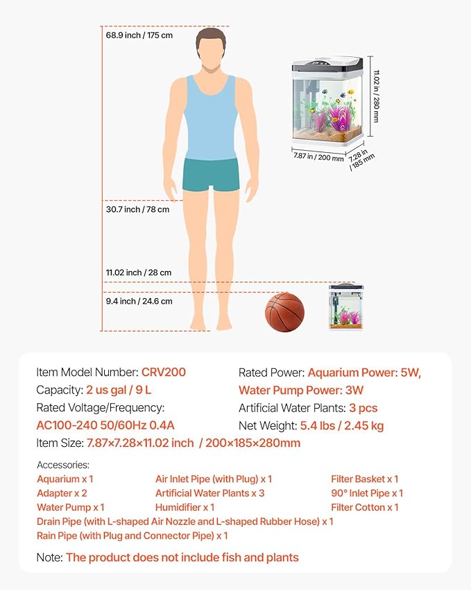 - Included Components : 90ยฐ Inlet Pipe x 1, Adapter x 2, Aquarium x 1, Filter Basket x 1, Water Pump x 1