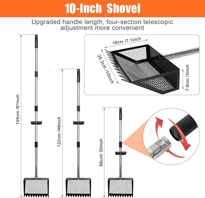 - Multi-function Sifting Shovel - Different lengths for different tasks. This sifting shovel for sand can be adjusted to the right length to be used as a cat litter scooper, beach search sand scoop and cow pens shovel, etc. Perfect for cleaning chicken litter, horse apples, dog piles, and cleaning out the sandbox. After use, the chicken coop accessories is very easy to clean with just water flushing