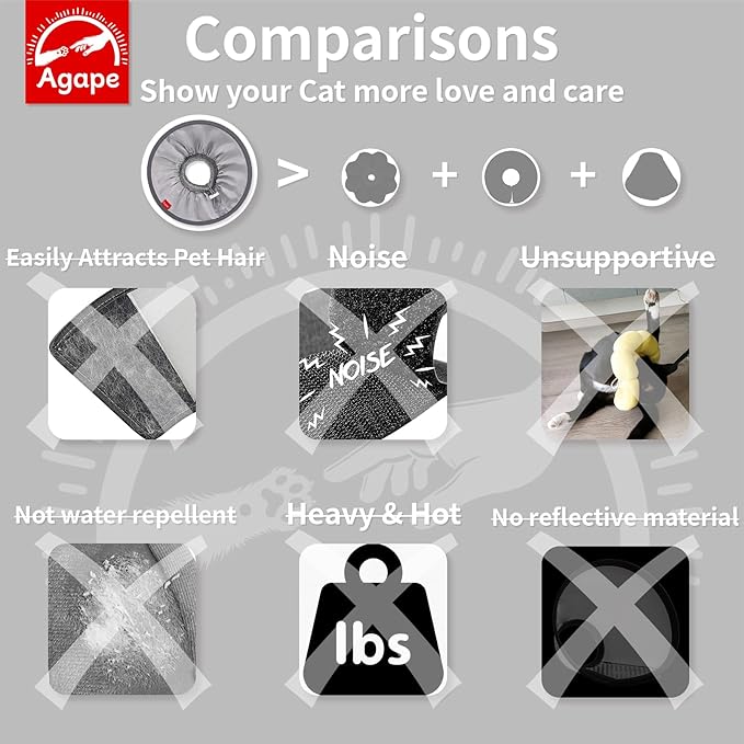 - 【Soft & Lightweight】Unlike bulky, uncomfortable cones on the market, Agape's cat cone is made with two layers of silky fabric and a ribbed knit collar, weighing just 0.9 ounces—about the same as a single AA battery. This ultra-light, breathable, and soft design ensures your cat can sleep peacefully and comfortably, without feeling any strain or restriction around their neck
