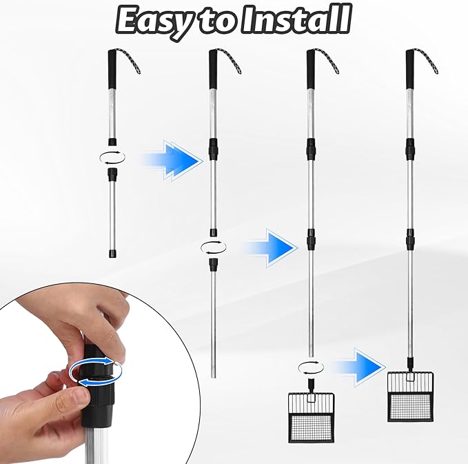 - [EASY TO INSTALL AND CLEAN]The scoop head of poop scooper for dogs features a non-stick, rust-resistant surface that’s easy to rinse clean with water. The threaded connections of chicken accessories for real chickens suitable with litter scooper allow for quick assembly and disassembly of the handle—convenient and user-friendly