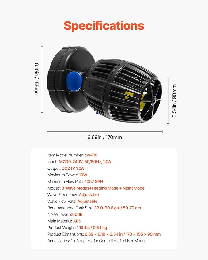 - Compact & Efficient: Designed for efficiency, our small yet powerful fish tank wave maker delivers up to 1057 GPH with only 10W of power consumption. Ideal for 50-70 cm aquariums, it operates securely with a 24V DC low-voltage power supply