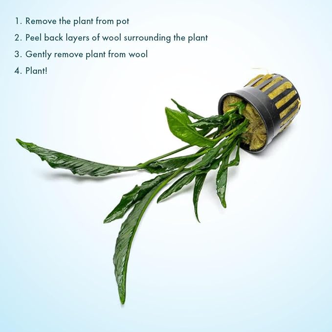 - Sold potted for easy transfer—remove plant from pot and attach to hardscape using glue or string. Do not bury the rhizome to prevent rot.