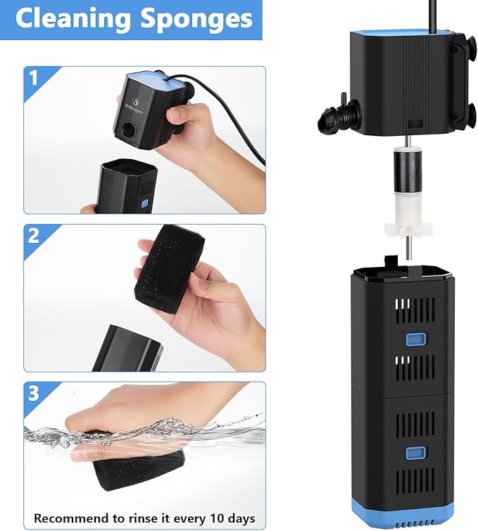 - DOUBLE FILTRATION – This aquarium filter features a powerful dual filtration system that effectively removes impurities and keeps your aquarium water crystal clear. The two sections of sponges helps break down waste, reduce odors, and keep your tank free of harmful chemicals, ensuring a cleaner, healthier environment for your fish.
