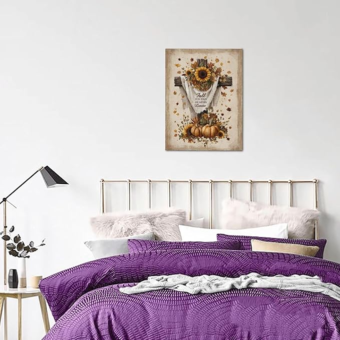 Christian Fall Wall Art Autumn Rustic Cross Sunflower Pumpkin Wall Decor Fall for Jesus He Never Leaves Pictures Painting Print Framed Artwork Decorations Gifts for Living Room Bedroom Prayer Room Office 12"x16"