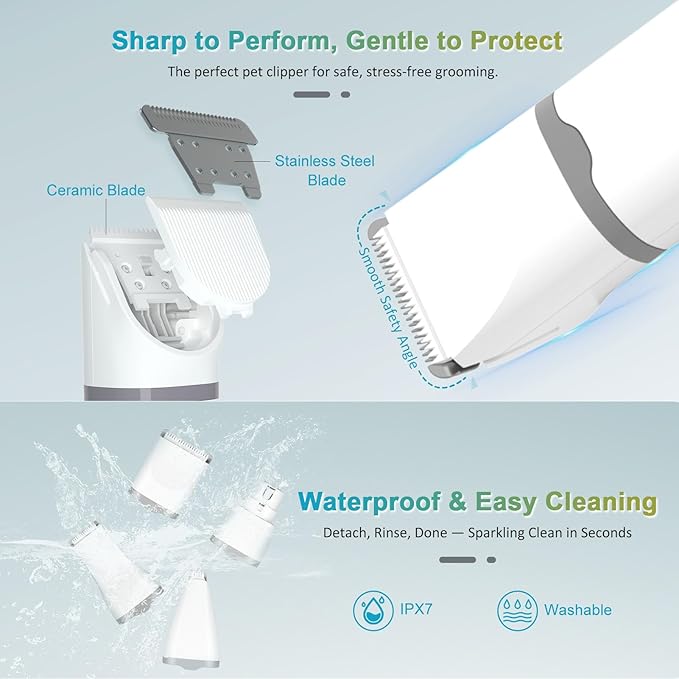 - Safe and Easy to Clean: Featuring stainless steel and ceramic blades, our dog grooming clippers ensure quick trimming, no pull the pet hair and no hurt the petโs skin. The blades of dog nail trimmer are detachable and washable, which can be directly rinsed underwater after use, making it easier to clean