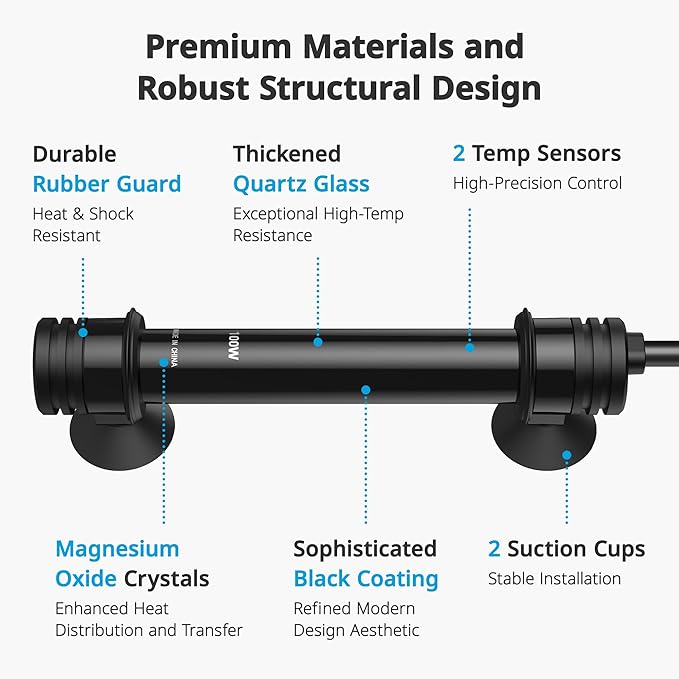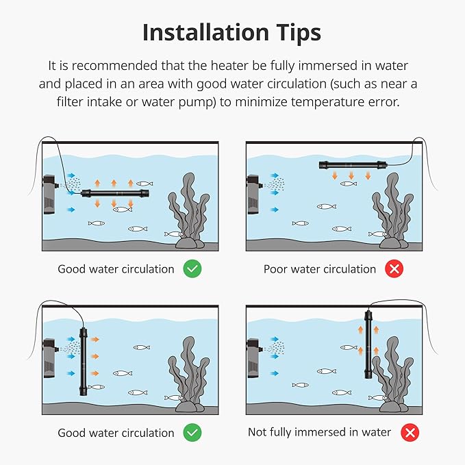 - Easy Installation: Includes suction cups for secure attachment to the aquarium wall. It is recommended that the heater be fully immersed in water and placed in an area with good water circulation to minimize temperature error