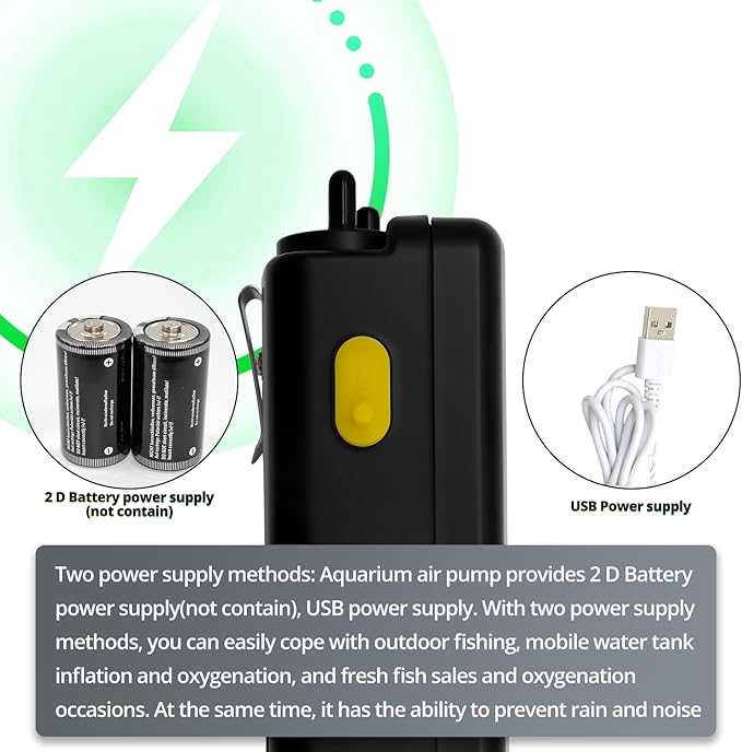 - Two power supply methods: Aquarium air pump provides 2 D Battery power supply(not contain battery), USB power supply. With two power supply methods, you can easily cope with outdoor fishing, mobile water tank inflation and oxygenation, and fresh fish sales and oxygenation occasions. At the same time, it has the ability to prevent rain and noise