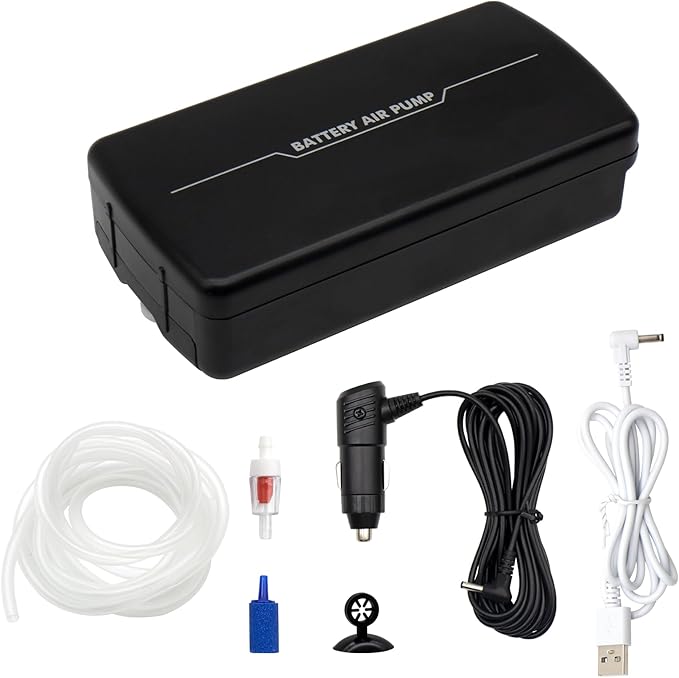 - [Packaging Content]: 1 x Aerator Pump For Bait Bucket;1 x Car Cigarette Lighter;1 x USB Charging Cord;1 x Air Stone;1 x Rubber Hose;1 x Check Valves;1 x Suction Cup;1 x Userโs Manual