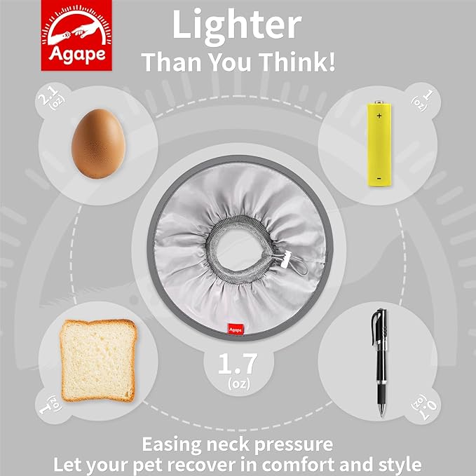 - 【Soft & Lightweight】Unlike bulky, uncomfortable cones on the market, Agape's cat cone is made with two layers of silky fabric and a ribbed knit collar, weighing just 1.7 ounces—about the same as two single AA battery. This ultra-light, breathable, and soft design ensures your cat can sleep peacefully and comfortably, without feeling any strain or restriction around their neck