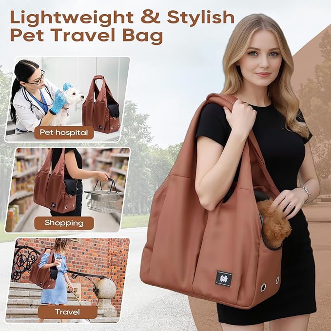 Dog Purse Carrier for Small Dogs, Cats, and Puppies – Soft-Sided Travel Pet Tote Bag with 4 Large Pockets, Foldable, Lightweight, Fits Pets up to 15 lbs, for Travel, Outings (Brown)