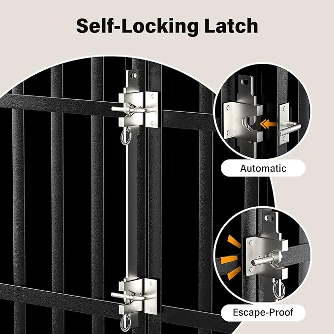 - Self-Locking Latch: Automatic door latch makes the door close easily with a slight push. And it's also an efficient mechanism for escape artists. The escape-proof latch ensures your dog stays securely inside the crate when you're away from home.